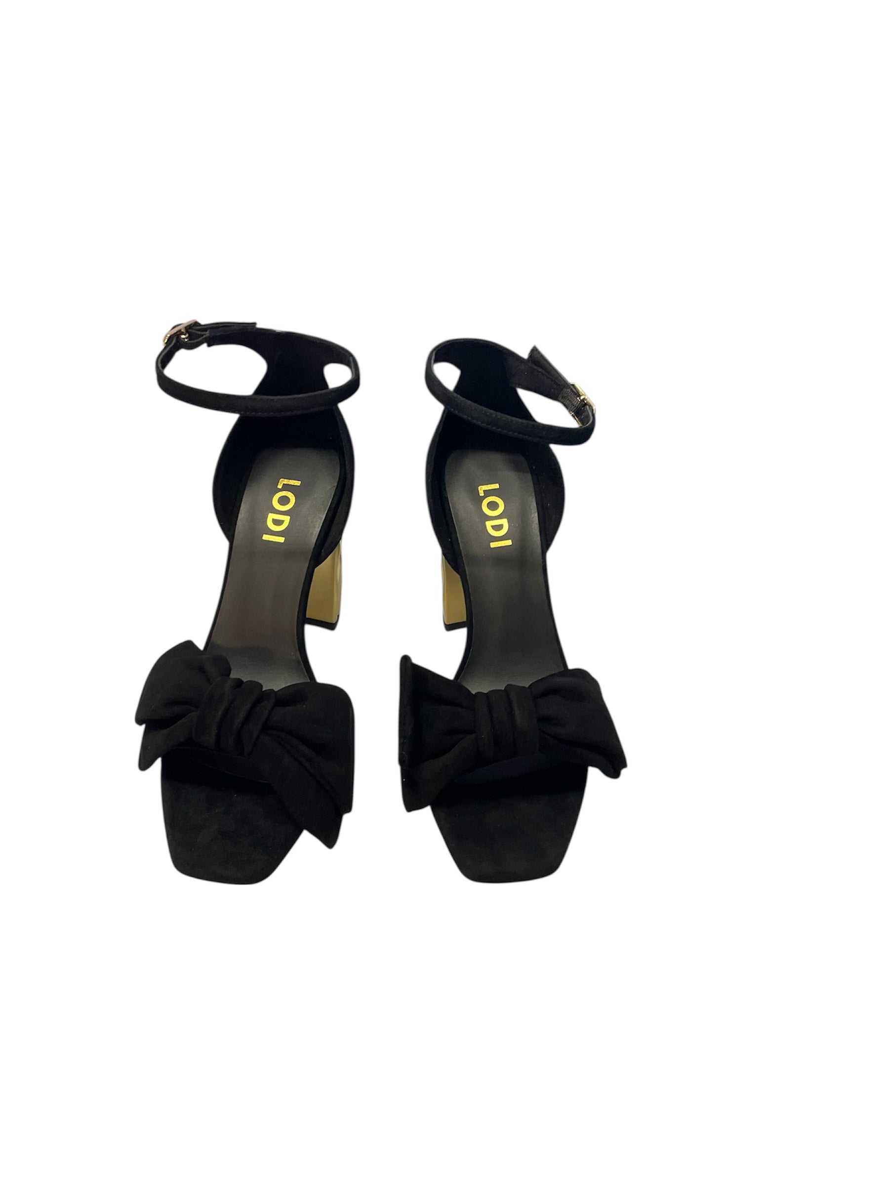 Lodi black suede sandals with gold block heel