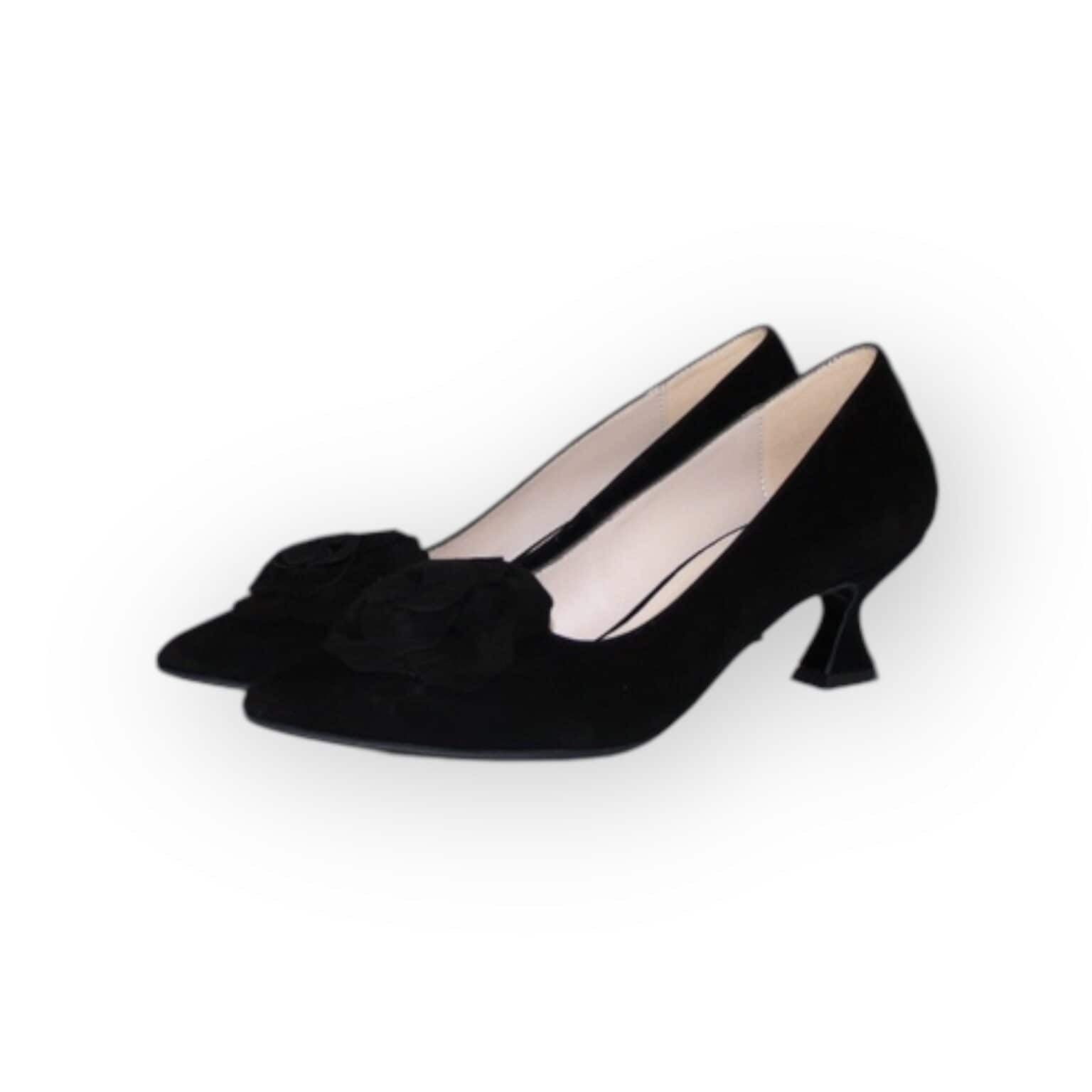 Indulge in pure luxury with these exquisite suede kitten heels, perfect for adding elegance to any outfit. The soft suede construction and delicate flower embellishment create a divine look that will stretch with wear. Available in magenta, orange, and red.