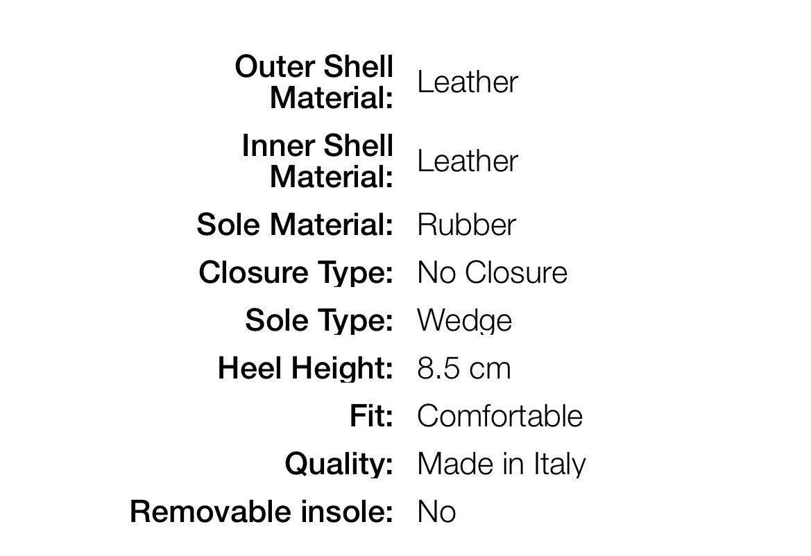 Experience luxurious comfort with these Italian-made nude wedge sandals. Crafted with high-quality leather and a slip-on design, these sandals feature an 8.5 cm heel and provide a snug fit for all-day wear. Plus, they also come in a nude version for even more versatility. Elevate your style game with these must-have sandals!