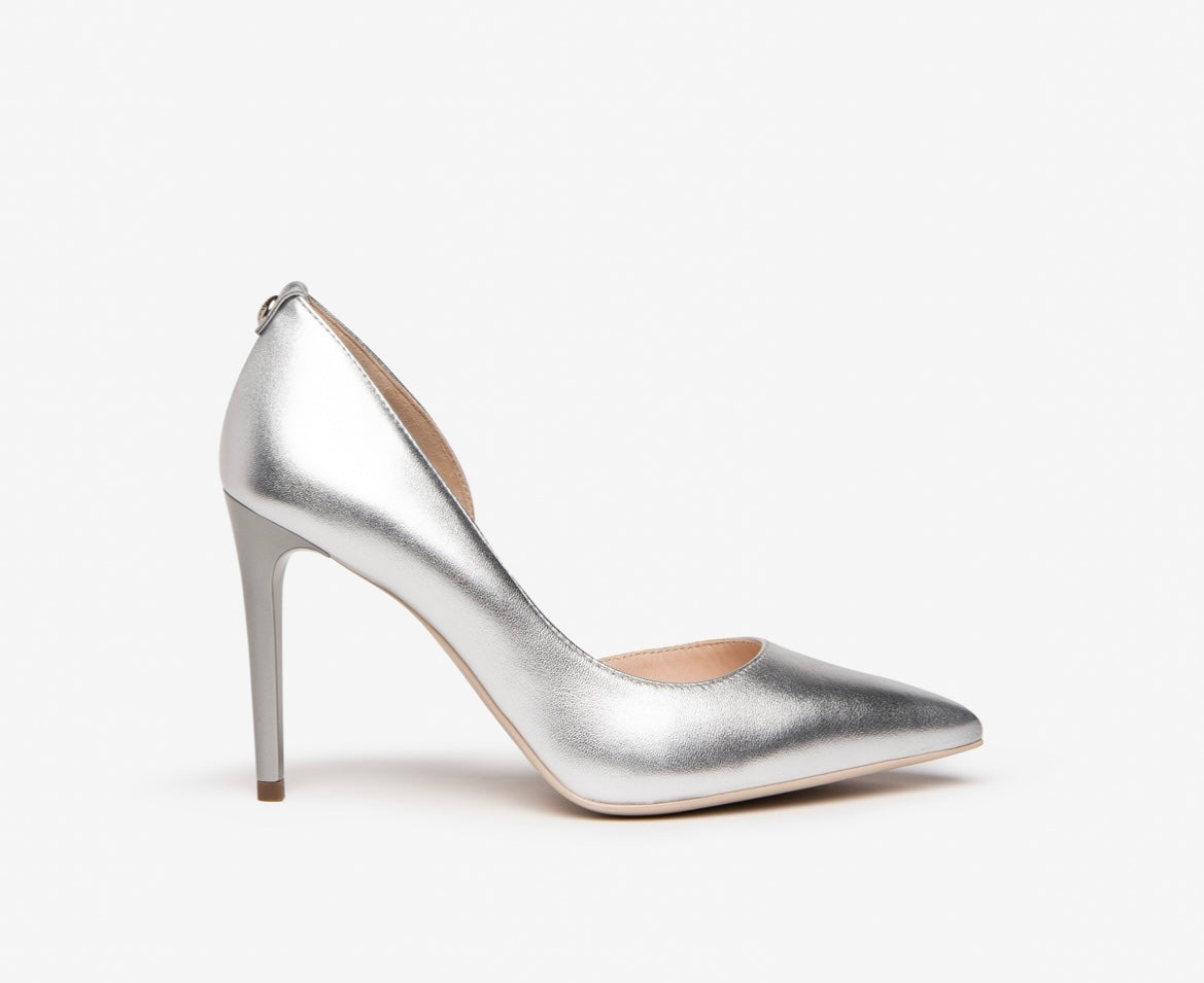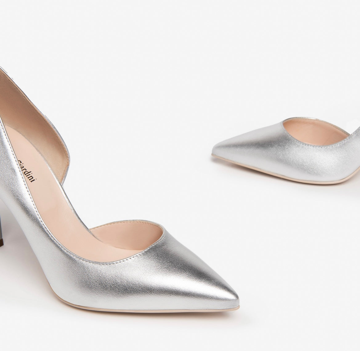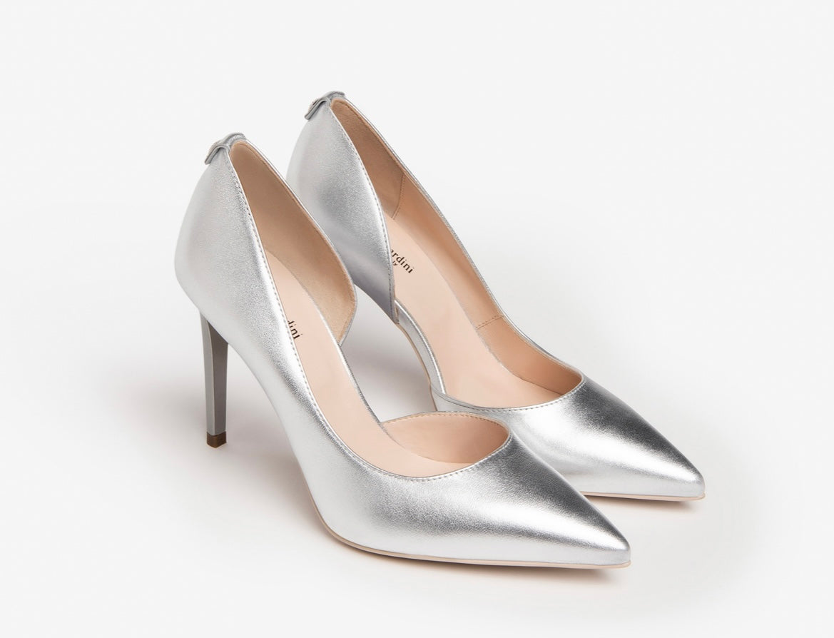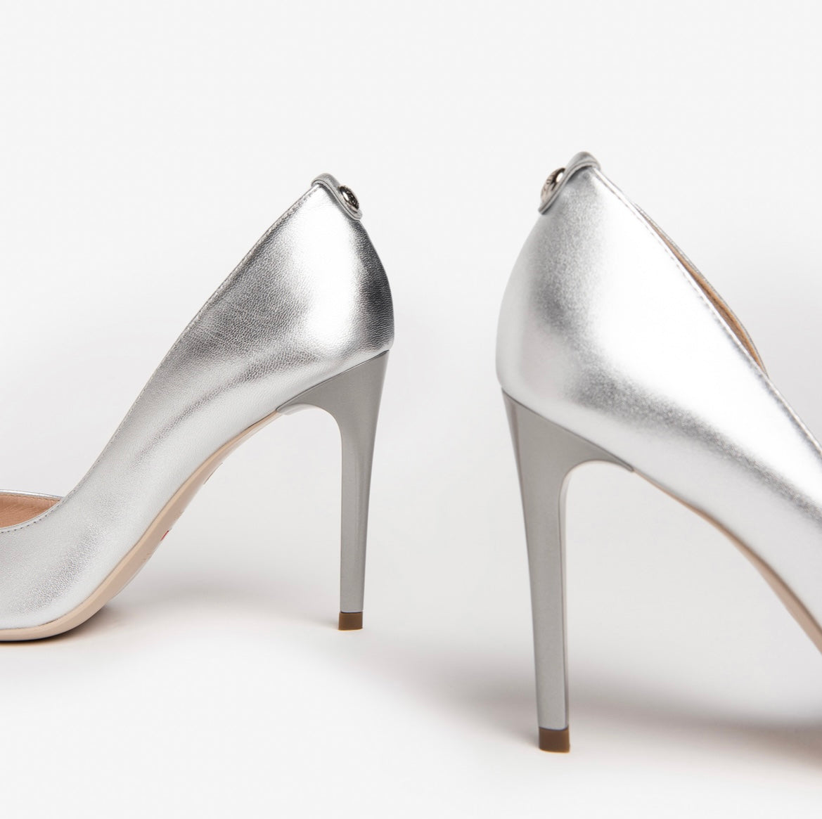 Crafted from luxurious leather with a sleek silver finish, these stiletto heels boast a heel height of 9.5cm. Handmade in Italy, these shoes provide a comfortable and stylish fit that exudes sophistication and exclusivity.