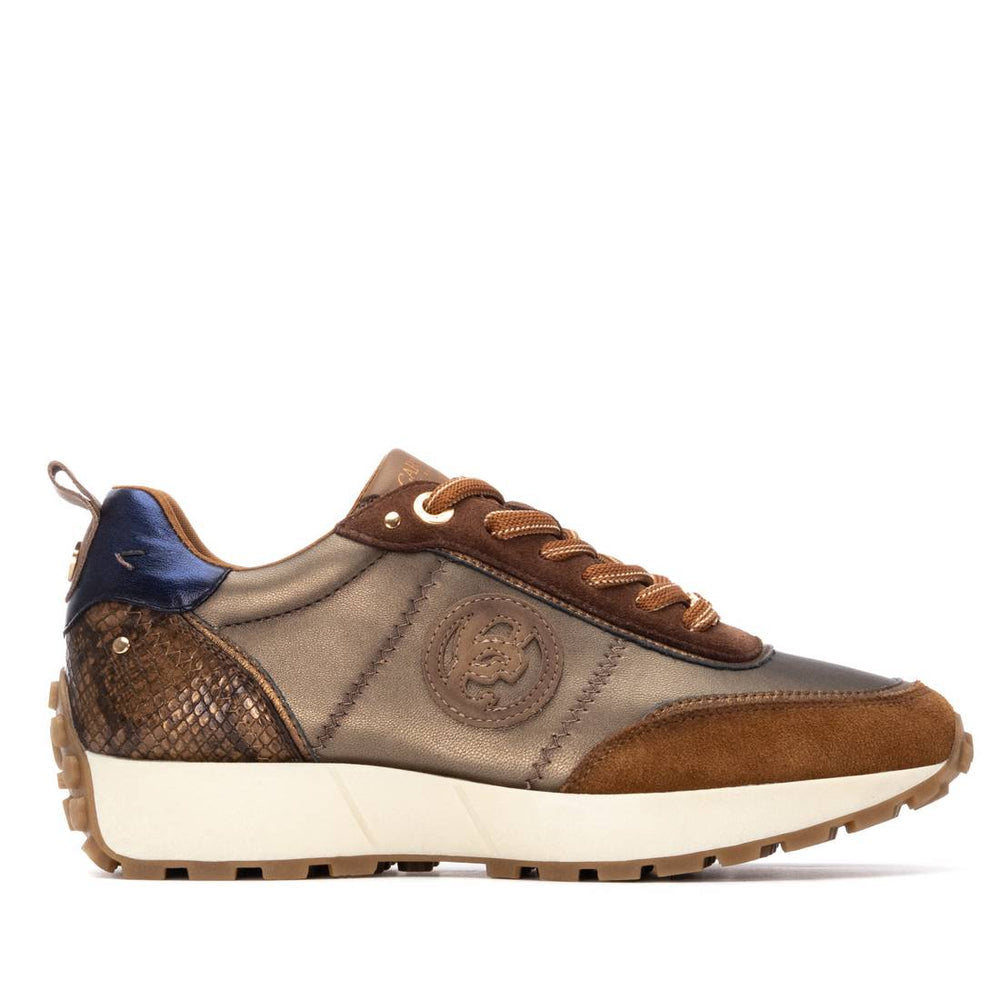 Made in Spain, these Carmela tan leather and suede sneakers are crafted from high-quality materials that exude luxury and style.